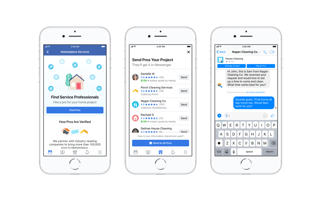 “More people ask for recommendations related to home services on Facebook in the U.S. than any other topic,” said Bowen Pan, Product Manager at Facebook, in a statement about the launch. “By partnering with Handy, HomeAdvisor, and Porch, people will now have a place on Marketplace to find the right professional to help with their next home project,” he said.
