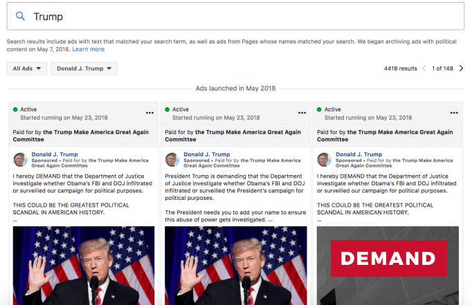 The labeling won’t just apply to candidate and election ads, but those dealing with political issues such as “abortion, guns, immigration or foreign policy.” Clicking through the labels that appear at the top of these News Feed ads will lead to the archive, which isn’t backdated and will only include ads from early May 2018 and after. The archive will hold them for seven years so they can be searched by keyword or the Page that ran them. It also will display the ad’s budget, and the number of people who saw it, plus aggregated, anonymized data on their age, gender and location.