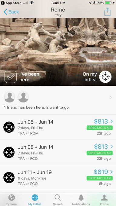 From my experience as a user, the app is straightforward and simple to use, and can easily serve as a place for travel inspiration and discovery. It’s also a fun utility for marking off where you’ve been and where you want to go, bucket-list style, and then keeping an eye on prices. But there are a ton of tools for cheap flight shopping, so you shouldn’t book through Hitlist without checking around to ensure it’s the best deal.