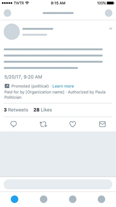 Orgs buying political ads will also have to comply with a stricter set of rules for how they present their profiles. Twitter will mandate that the account header, profile photo and organization name are consistent with how the organization presents itself online elsewhere, a policy likely designed to ensure that orgs don’t try to obfuscate their identity or present their accounts in a way that would confuse users that the account belonged to a political organization.