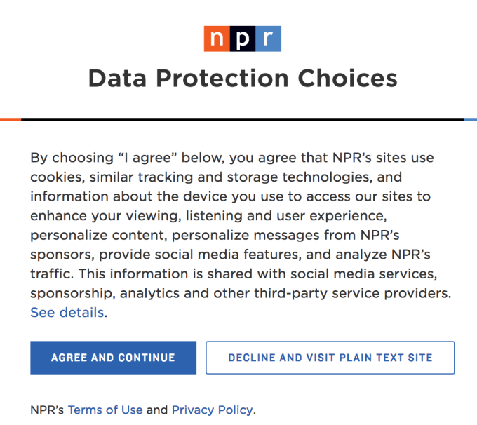 While Tronc deemed its European readership disposable, at least in the short-term, most major national U.S. outlets took a different approach, serving a cleaned-up version of their website or asking users for opt-in consent to use their data. NPR even pointed delighted users toward a plaintext version of their site.