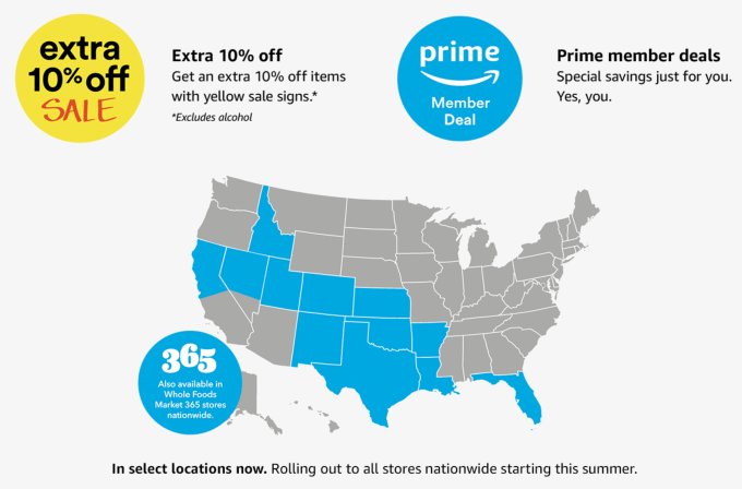 The offer was launched in Florida first but this expansion is the first of a wave that are designed to allow Prime customers across the entire U.S. to get discounts at Whole Foods and Whole Foods Market 365 stores by the end of this summer. Whole Foods currently has over 470 stores in the U.S., Canada and U.K. combined, but the majority — 463 to be precise — are in the U.S so there’s plenty of work to do. That said, Amazon said all Whole Foods Market 365 stores in the U.S. are now covered.