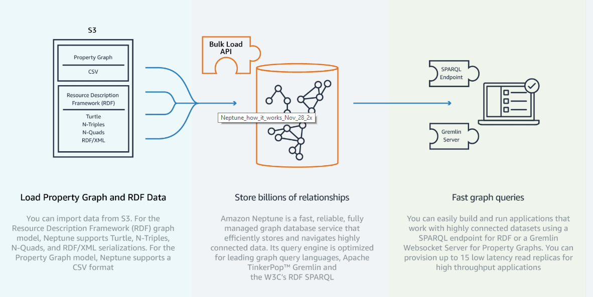 Neptune supports graph APIs for both TinkerPop Gremlin and SPARQL, making it compatible with a variety of applications. AWS notes that it built the service to recover from failures within 30 seconds and promises 99.99 percent availability.