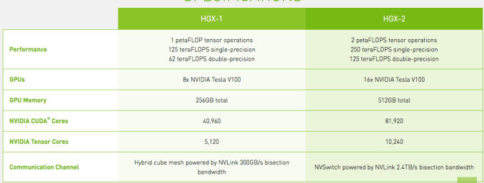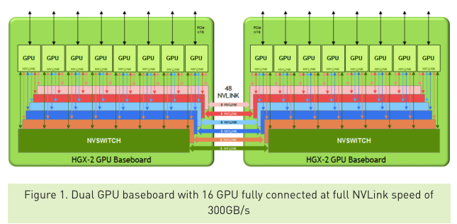 You know you want to know the specs, so let’s get to it: It starts with 16x NVIDIA Tesla V100 GPUs. That’s good for 2 petaFLOPS for AI with low precision, 250 teraFLOPS for medium precision and 125 teraFLOPS for those times when you need the highest precision. It comes standard with a 1/2 a terabyte of memory and 12 Nvidia NVSwitches, which enable GPU to GPU communications at 300 GB per second. They have doubled the capacity from the HGX-1 released last year.