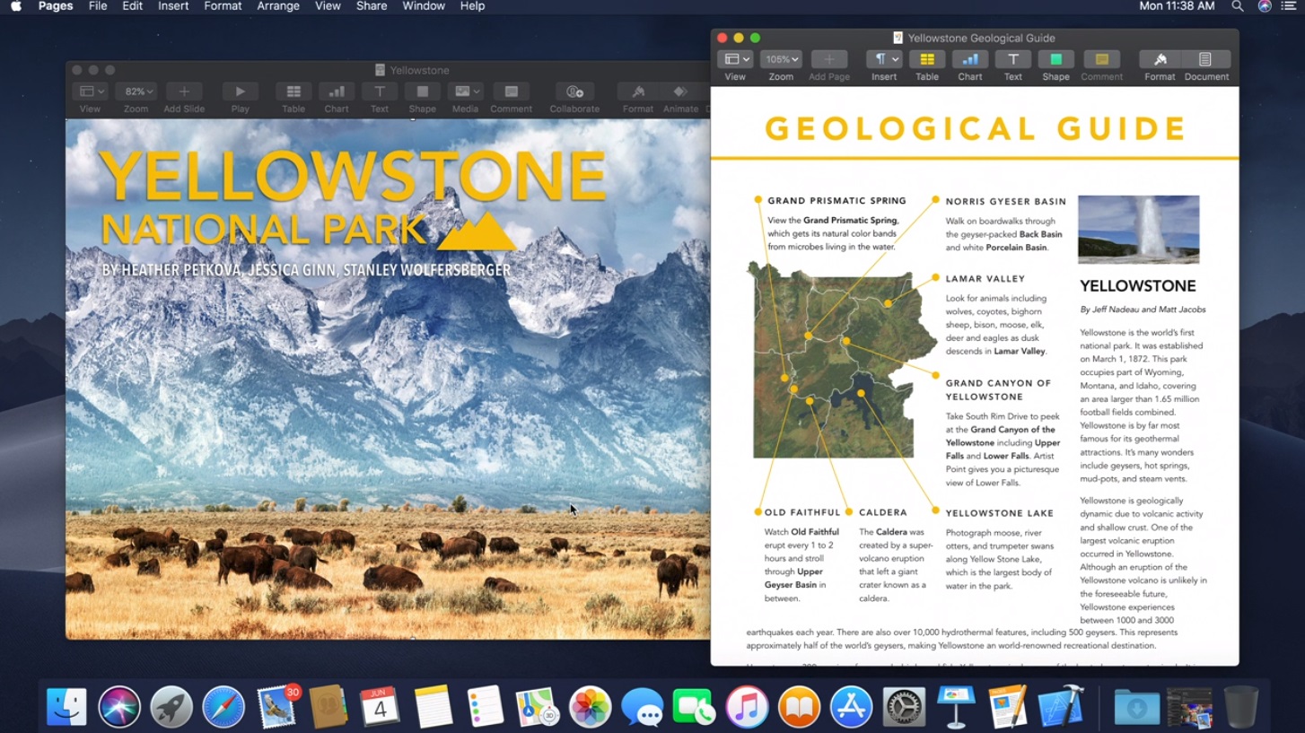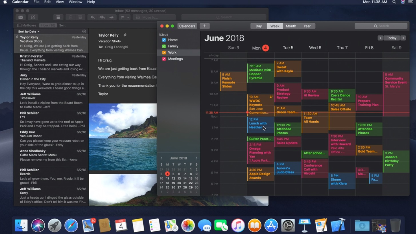Apple’s senior vice president of Software Engineering Craig Federighi started with dark mode. With a single setting, you can invert the colors of everything. Even the background of the Finder, Calendar or Photos is black, not just the Dock or menubar. Apple had to redo all the buttons and color schemed across the operating system. If you find white documents too aggressive, dark mode is for you.
