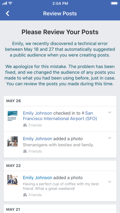 “We recently found a bug that automatically suggested posting publicly when some people were creating their Facebook posts. We have fixed this issue and starting today we are letting everyone affected know and asking them to review any posts they made during that time. To be clear, this bug did not impact anything people had posted before – and they could still choose their audience just as they always have. We’d like to apologize for this mistake.”