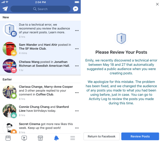 Facebook tells TechCrunch that it hears loud and clear that it must be more transparent about its product and privacy settings, especially when it messes up. And it plans to show more of these types of alerts to be forthcoming about any other privacy issues it discovers in the future.