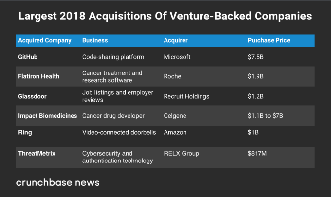 Flatiron Health, a provider of software used by cancer care providers and researchers, ranks as the second-biggest VC-backed acquisition of 2018. Its purchaser, Roche, was an existing stakeholder who apparently liked what it saw enough to buy up all remaining shares.