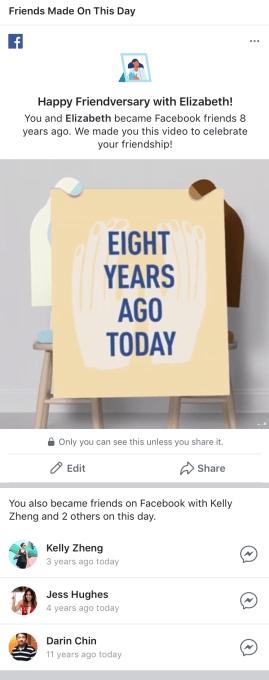 Among the other options you’ll see here is the “Friends Made on this Day” feature, which includes a list of friends you made on this same day in the past. You’ll also see special videos and collages to celebrate your “friendversaries” – the term Facebook coined for celebrating the day you and someone became Facebook friends.