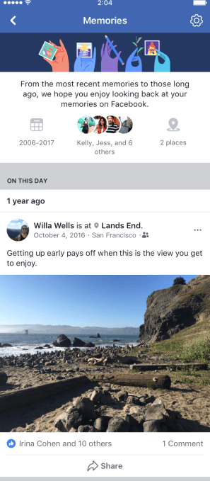 Facebook today is introducing a dedicated page called “Memories,” where you can reflect on the moments you’ve shared with family and friends over the years. The page is essentially an expanded collection of familiar Facebook features, like “On This Day,” which lets you look back on this date last year and the years prior, as well as other memory recaps and memories you’ve shared with friends.