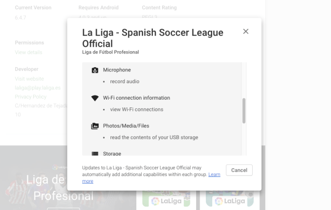 To wit: La Liga, an app for fans of Spanish soccer which has been discovered using microphone access combined with the precise GPS location of Android users to listen in on people’s surroundings during match times — in a bid to catch bars that might not have a license to broadcast the match being watched.