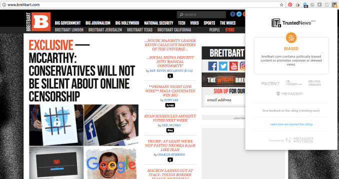 The beta browser extension, which is called Trusted News (initially it’s just available for Chrome), is intended to help Internet users spot sources of fake news when they’re exposed to content online.