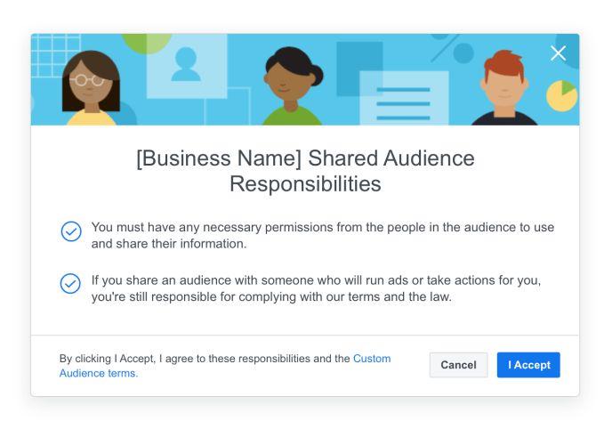 Companies can only share Custom Audiences info with partners like ad agencies if they’re formally connected through Facebook’s business manager tool. And Facebook will start to show advertisers reminders that they need consent for contact info ad targeting and force all users connected to an ad account to confirm these terms.
