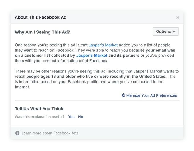 Now at least Facebook will show this “Original Data Source” field asking who collected the uploaded phone numbers or emails. Users can check out this info if they click the “Why Am I Seeing This Ad?” button in the drop-down. However, Facebook stops short of scanning the lists for suspicious info, such as blocks of contact info that match hacked or purchased data sets.