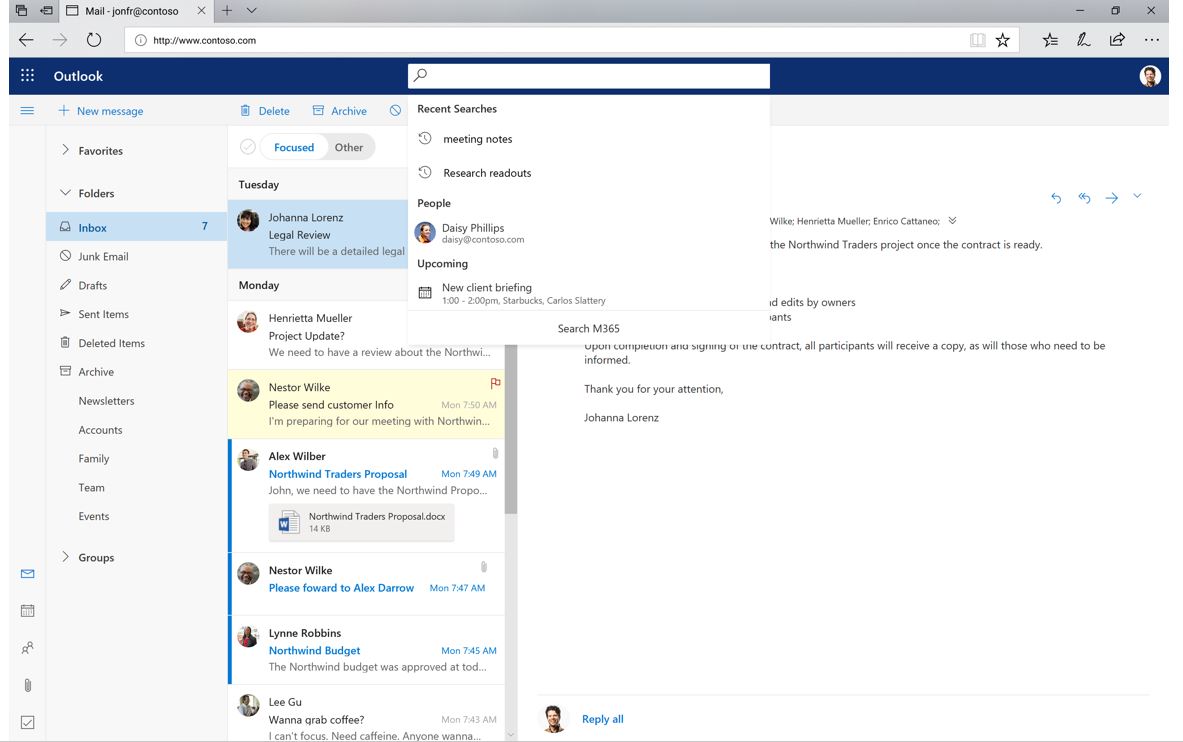 Another new feature that’s less about the design but the user experience is the launch of what Microsoft calls ‘zero query search.” This AI- and Microsoft Graph-powered feature is meant to bring up useful recommendations for your searches every time you place your cursor into the search box. For commercial users, this feature is already live in Office.com, SharePoint Online and the Outlook mobile app. It’ll roll out to Outlook on the web in August.