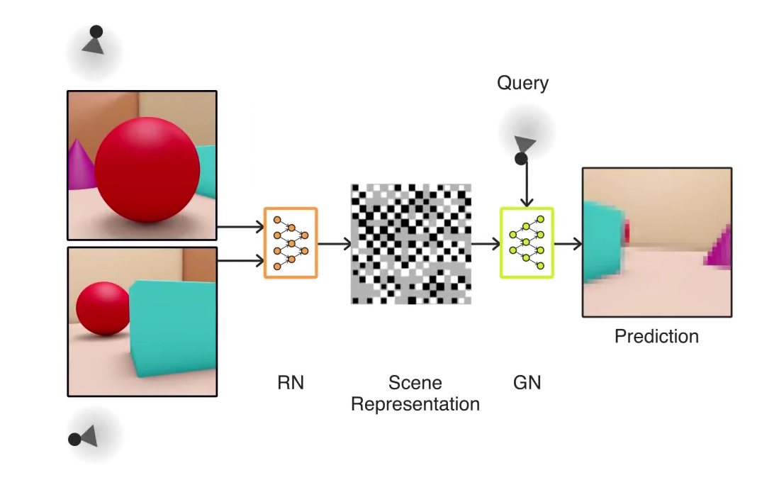 It works, roughly speaking, like this. One half of the system is its “representation” part, which can observe a given 3D scene from some angle, encoding it in a complex mathematical form called a vector. Then there’s the “generative” part, which, based only on the vectors created earlier, predicts what a different part of the scene would look like.