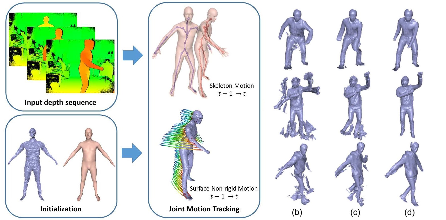 As you can see above, depth data from the camera is combined with some basic reference imagery of the person to produce both a skeleton and track the joints and terminations of the body. On the right there, you see the results of just DynamicFusion (b), just BodyFusion (c) and the combined method (d).