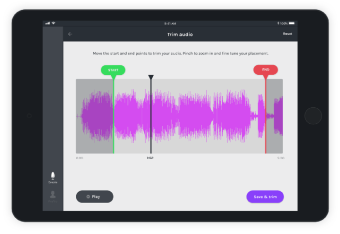The controls allow you to trim the beginning and end of your podcast, so you can cut out issues like false starts or other chatter. And you can split audio clips in order to insert transitions, voice messages, music, and other audio.