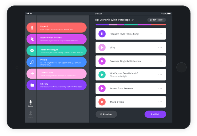 Following its relaunch earlier this year as a podcast creation platform, Anchor today is bringing its suite of mobile podcasting tools to the iPad. Like its iPhone counterpart, the iPad version of Anchor lets you record, edit, then distribute your podcast anywhere, including iTunes and Google Play Music. The new app is also customized for touch-based editing, and it takes advantage of iPad features like drag-and-drop and multitasking.