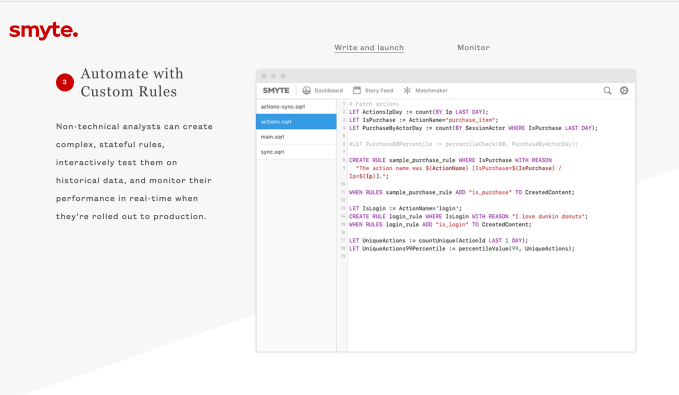 Non-technical analysts could use Smyte to create custom rules tested on historical data, then roll them out to production and watch how they perform in real-time.