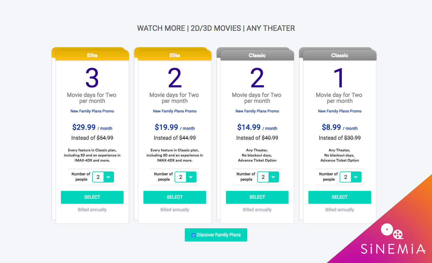 A day after MoviePass announced upcoming surge pricing, Sinemia is introducing a new deal group deal for families. The plans start at $9 a month for one movie for two people and goes up considerably from there, topping out at ten times that amount for three movie days a month for six people.