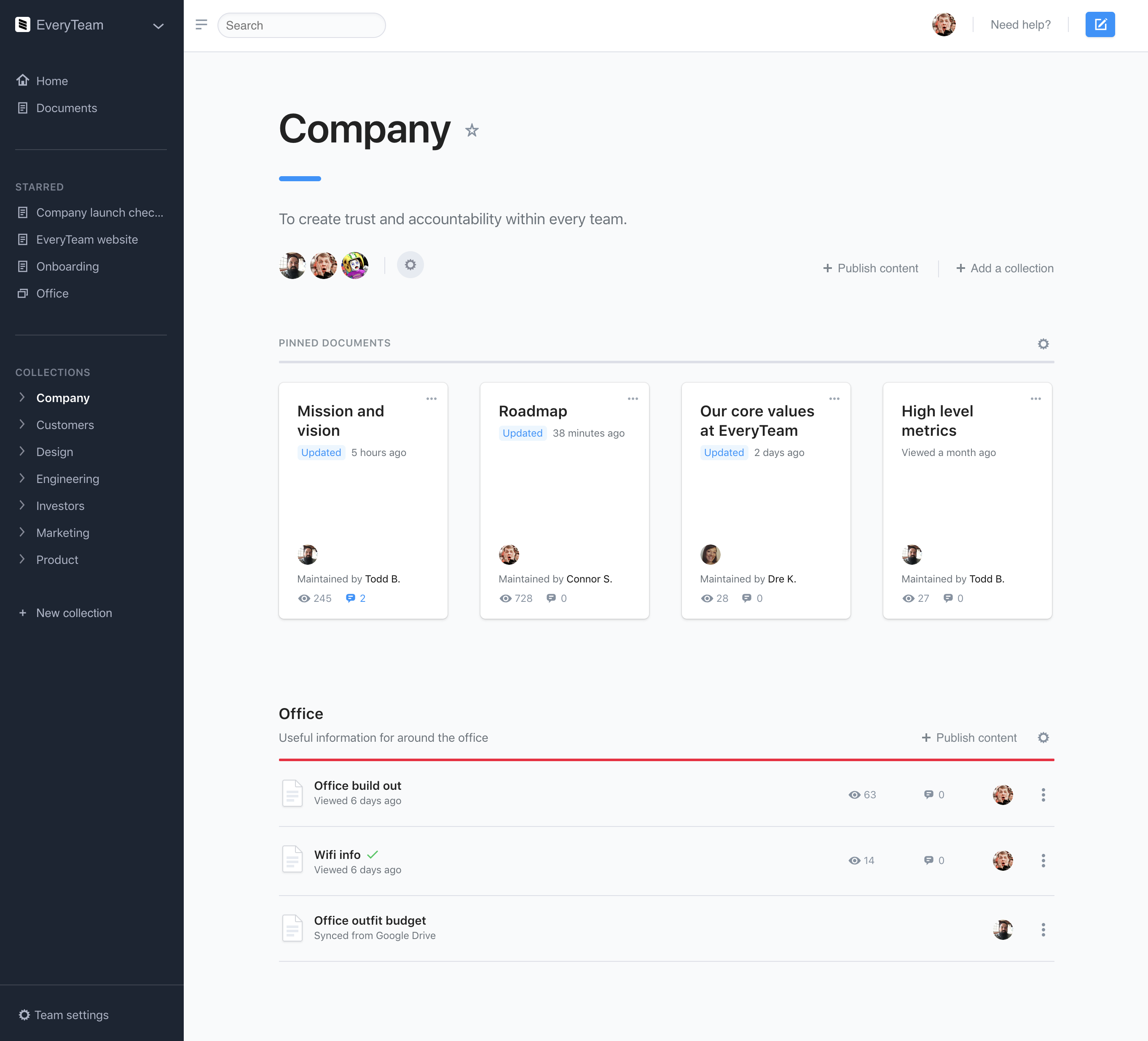 As companies get bigger and bigger, all the critical information about a company — even its mission and culture statements — can get lost in a massive pile of Google Docs or files strewn across dozens of collaboration tools, making it nearly impossible to find. That’s where the team behind EveryTeam hopes to step in and clean things up.