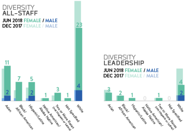 AnitaB.org released its first diversity report in December 2016. At that time, AnitaB.org was 59.5 percent white, 17.5 percent Asian, 9 percent black and 9 percent Latinx. The organization did not disclose diversity at the leadership level, which was notable given that both former and current AnitaB.org employees earlier that year told me there was a lack of people of color in leadership positions.