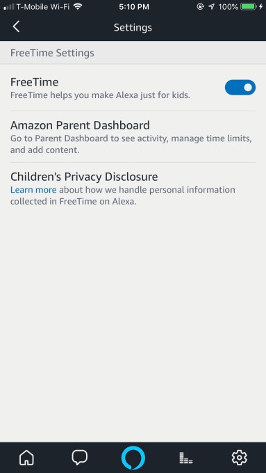 You can disable the explicit filter from the Parent Dashboard, but this option is inconveniently available just via the web. When you dig around in the Alexa app – which is where you’d think these controls would be found, there’s only a FreeTime On/Off toggle switch and instructions to “Go to the Parent Dashboard to see activity, manage time limits, and add content.”