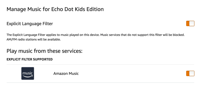 For starters, if you plan on using the explicit language filter on songs the Echo Dot plays, then you’re stuck with Amazon Music. While the Echo Dot itself can play music from a variety of services, including on-demand offerings from Pandora and Spotify, you can’t use these services when the explicit filter is enabled as “music services that do not support this filter will be blocked,” Amazon explains.