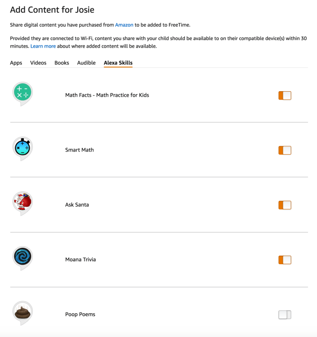 To make matters more confusing is the fact that Amazon has partnered with some kids skill publishers, similar to how it partnered with other content providers for apps and movies. That means there’s a list of skills that don’t appear in your Parent Dashboard that also don’t require whitelisting.