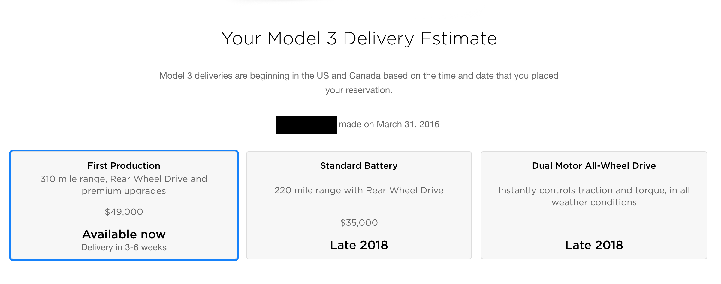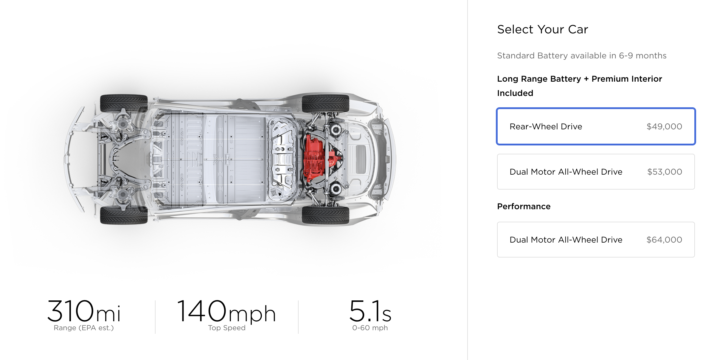 Reservation holders can now choose from three versions of the Model 3: the long-range 310-mile rear-wheel drive, long-range dual motor all-wheel drive or the performance variant. Delivery estimates will be shown to customers as they make their selection and will depend upon their order date and the vehicle configuration selected.