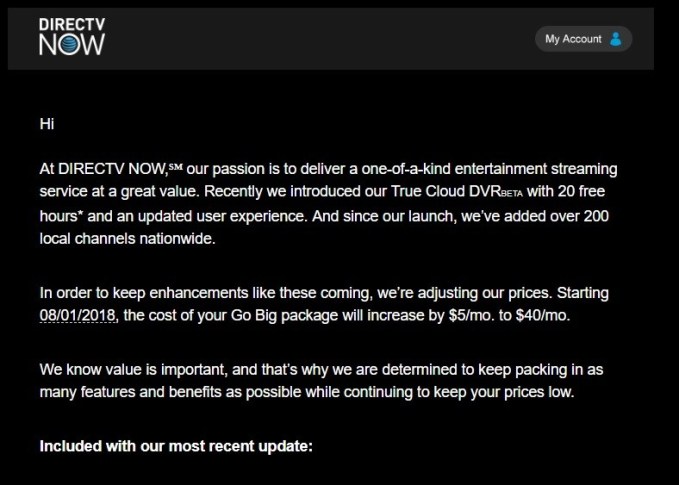 Following last week’s launch of its low-cost streaming TV service, Watch TV, AT&T is now raising prices on its original over-the-top offering, DirecTV Now, by $5 per month. That means instead of starting at $35 per month for its basic “Live a Little” tier with 60+ channels, the new service will start at $40 per month. The other tiers are going up by $5 per month, as well.