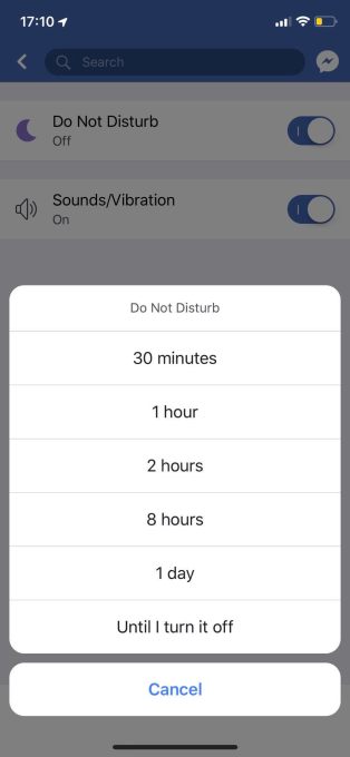 Meanwhile, TechCrunch has learned that both Facebook and Instagram are prototyping Do Not Disturb features that let users shut off notifications from the apps for 30 minutes, one hour, two hours, eight hours, one day or until they’re turned back on manually. WhatsApp Beta and Matt Navarra spotted the Instagram and Facebook Do Not Disturb features. Facebook is also considering allowing users to turn off sound or vibration on its notifications. Both apps have these Do Not Disturb features buried in their code and may have begun testing them.