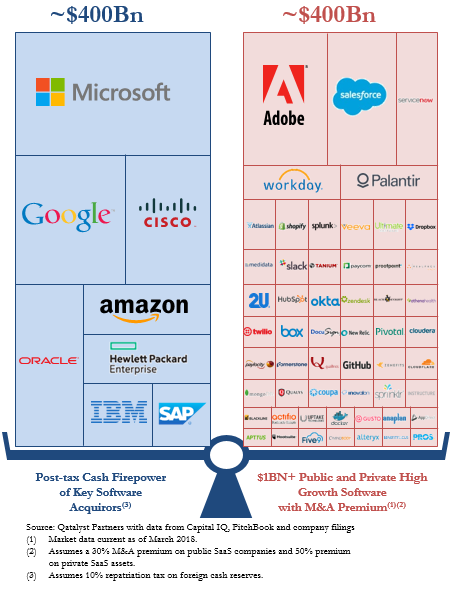 According to investment bank Qatalyst Partners, both changes could leave a group of the largest traditional tech-company acquirers with an additional $400 billion to spend, if they repatriate money from overseas. This would be enough to buy 50 leading software companies today, according to Qatalyst. We have already seen some of this with the recent acquisitions of GitHub by Microsoft ($7.5 billion) and Adaptive Insight by Workday ($1.55 billion) and Q1 deals like MuleSoft by Salesforce ($6.5 billion) and CallidusCloud by SAP ($2.4 billion).