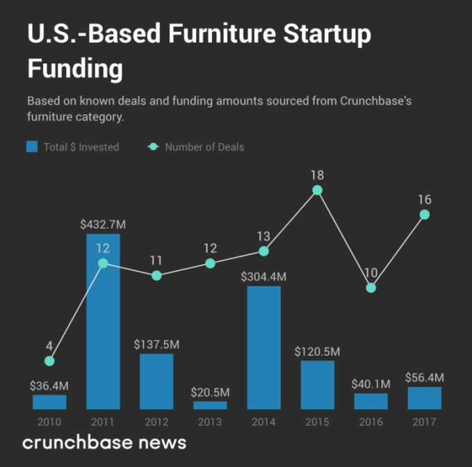 Total dollars funneled into U.S.-based furniture startups, according to Crunchbase, hit an all-time high of $432.7 million across 12 rounds in 2011. Wayfair, an e-commerce site dedicated to selling furniture, raised a significant $165 million Series A that year, accounting for more than a third of the total deal volume.