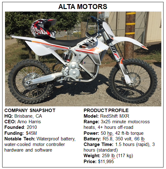 Brisbane, California based Alta Motors focuses primarily on producing electric powered off-road machines. Four of Alta’s five models—including the three that are street legal—are specialized for dirt riding. The MX and Redshift MXR motorcycles are full on motocross racers.