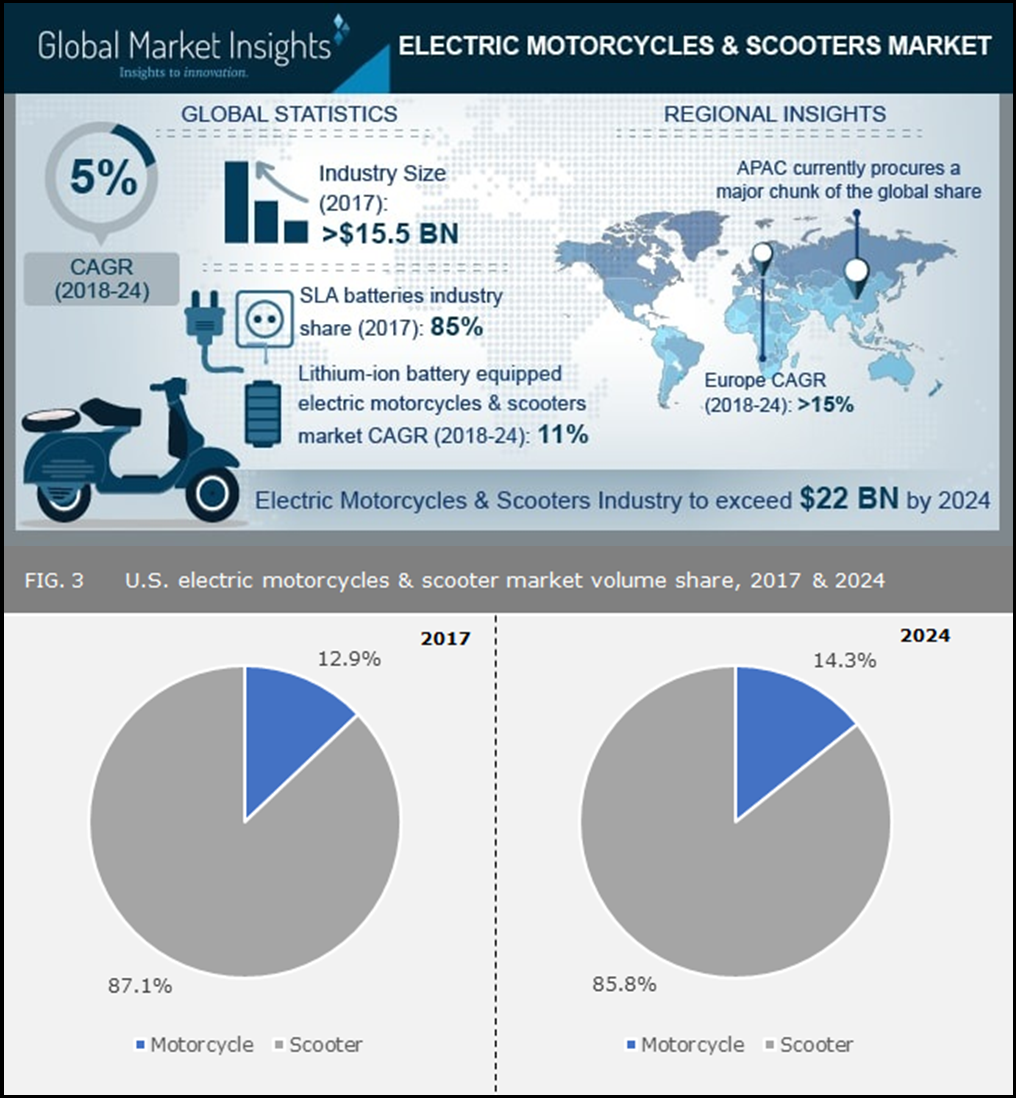 On U.S. e-motorcycle sales, Global Market Insights (GMI) recently tallied 2017 combined American e-scooter and moto sales at 245K units worth $155M. Following worldwide trends, GMI projects that to grow to 598K and $304M by 2024, with the share of U.S. e-motorcycles to scooters increasing.