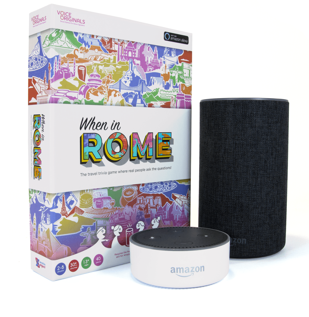 The first company to try this is Sensible Object. Their new game, When in Rome, is a family board game that pits two teams against each other in a race to travel the world. The game itself consists of a board and a few colored pieces; the real magic comes from Alexa. You start the game by enabling the When in Rome skill, then you start the game. Alexa then prompts you with questions as you tool around the board.