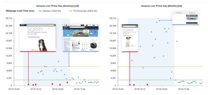 Typically, users may wait 2 to 3 seconds for a website home page to load, but during the Prime Day outage, the home page was taking 6, 7 and even as high as 8, 9 or even 10+ seconds to load on the desktop. And on mobile, webpage load times were even slower – reaching as high as 30 seconds at times across the U.S.