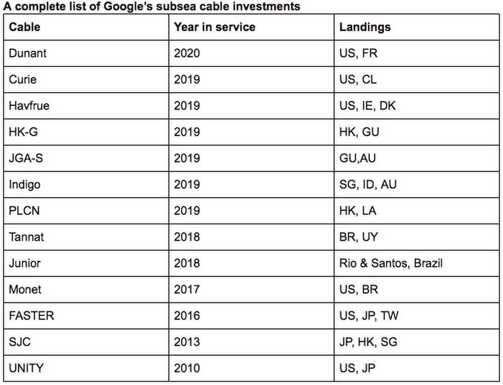 This marks Google’s fourth private cable. Its first two efforts spanned significantly shorter distances, though its “Curie” cable connects Los Angeles and Chile. Over the course of the last few years, Google has also made significant investments in consortium-driven cables that span the Atlantic and the Pacific, and quite a few of these will go online in 2019.
