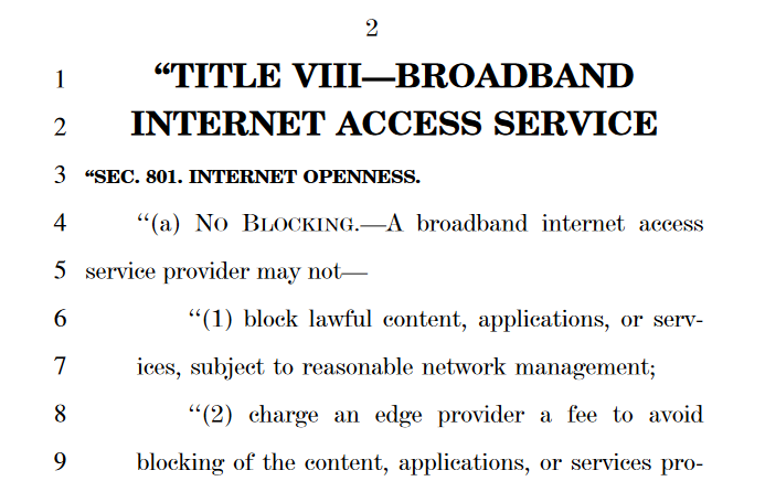 The bill, announced online and at an event in Washington, DC today, would modify the Communications Act of 1934 (greatly built upon by the 1996 Telecommunications Act) and add a new “Title VIII” full of stipulations specific to internet providers.