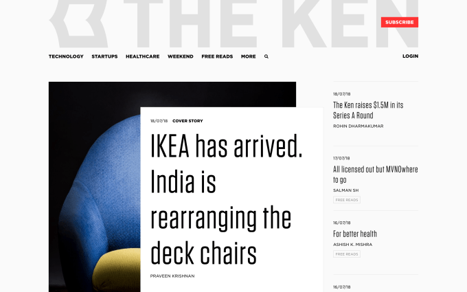 The Ken has made its mark by publishing one thoughtfully reported long-form story each day. An annual subscription is priced at Rs 2750 (around $43) in India or $108 overseas, there are also options for quarterly and single-story access. Thus far it has covered technology startups, healthcare and business verticals but now it is aiming to expand that focus.