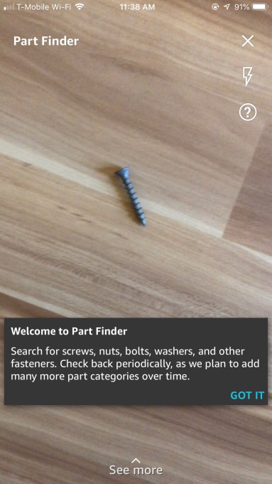 Got an odd screw, nut, bolt, washer or fastener you need to buy more of, but have no idea to how to find the right one? Amazon’s “Part Finder” can help. The company has rolled out a new feature on mobile that lets you point your camera at the item in question, so Amazon can scan it, match it, then direct you to matching items from its product catalog.