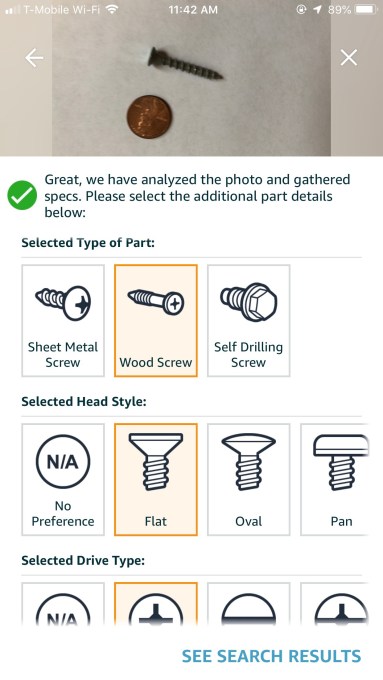 On the following screen, you add more information to help narrow down the results. For example, we scanned a screw and it asked for other details like whether it was a flat head and the drive type. (Some of this information could have been derived from the scan, one would think, so it’s not clear how much Amazon is relying on the scan itself versus user input here.)