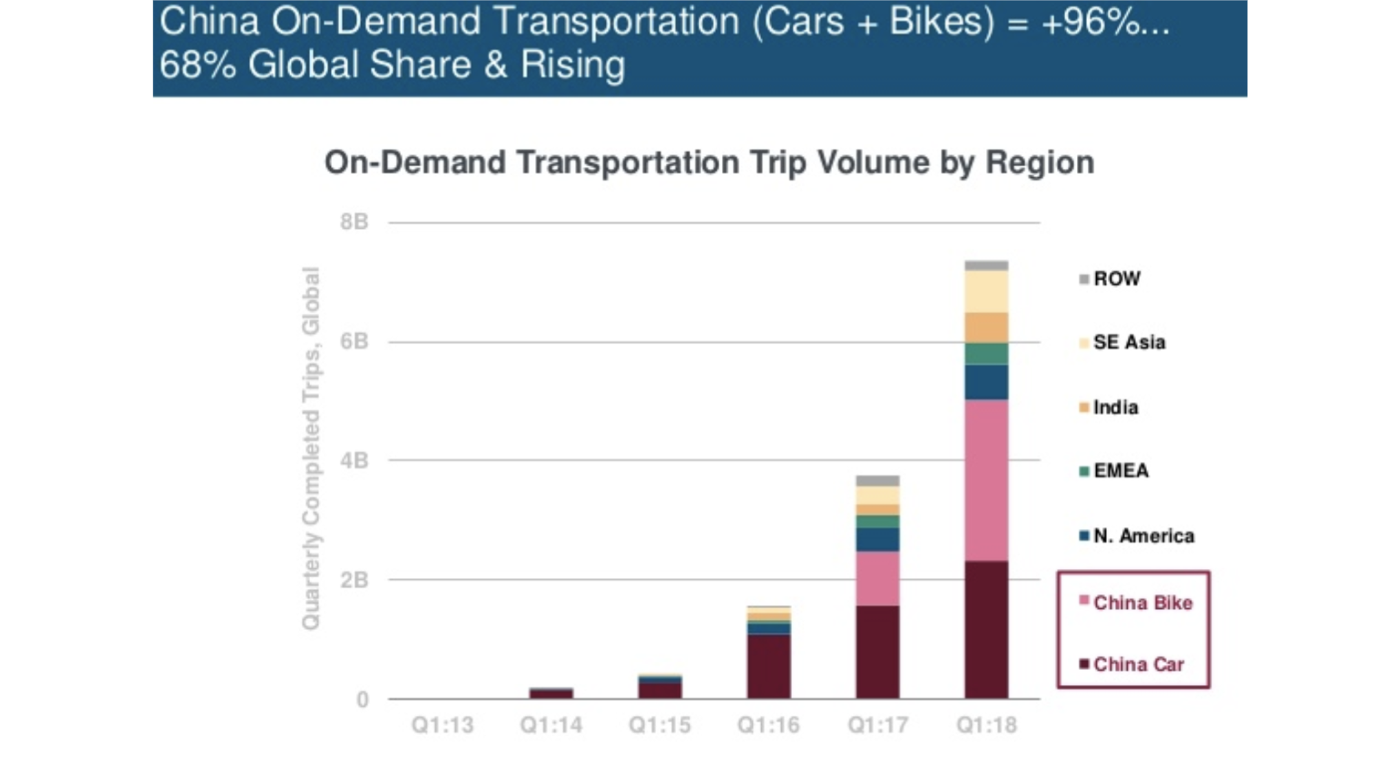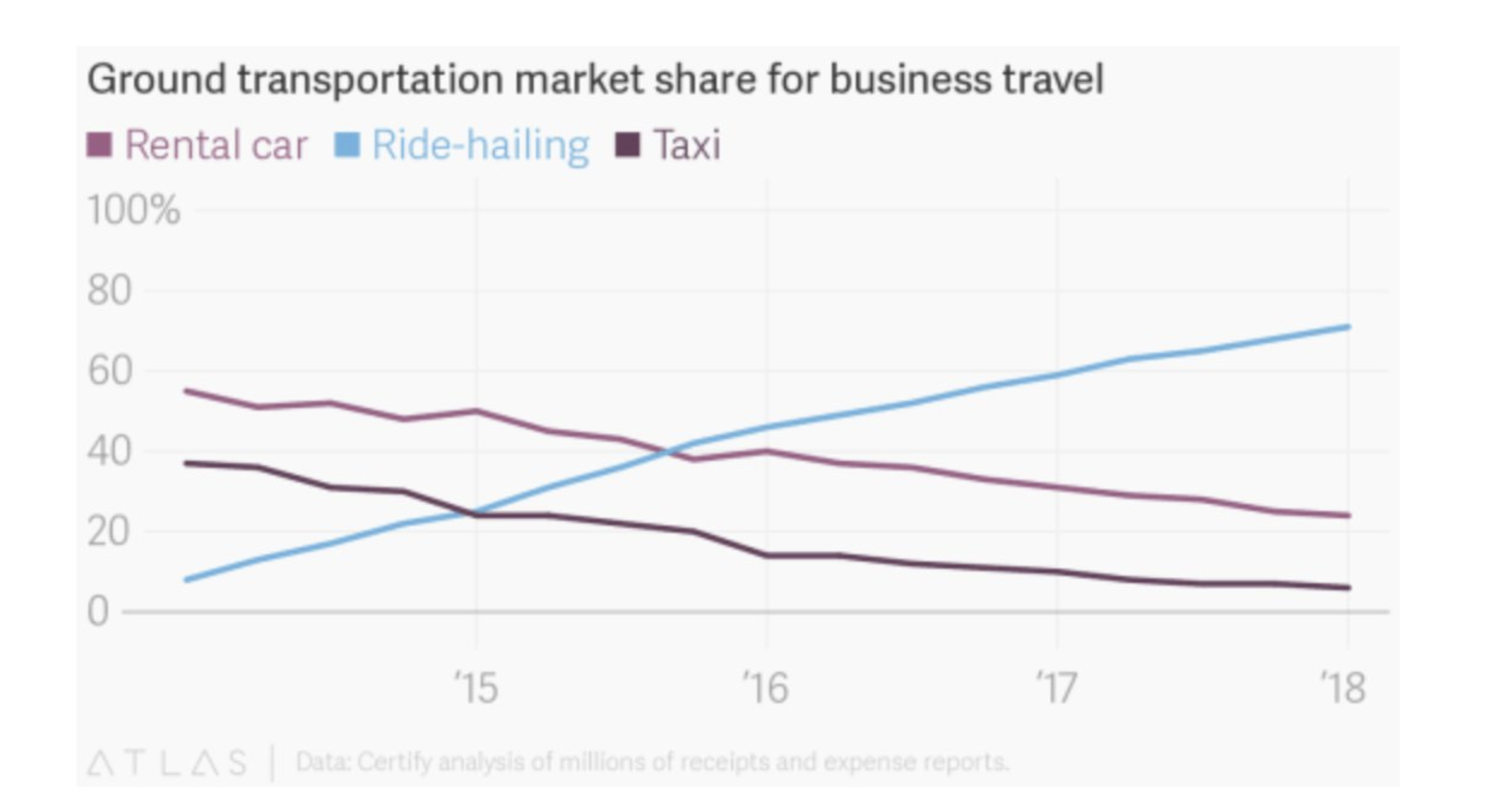 The practice of sharing rides came out of nowhere five years ago, and two years ago, docked bike share seemed to be rewriting what was possible with on-demand transportation. (Let’s see if/where scooters show up in Q1:19.) It’s hard to appreciate the impact of these new mobility models until you look at them against some well-established existing modes of transportation like taxis and car rentals. These industries trace their roots back to the explosion of the automobile with Model Ts a century ago and to when entrepreneurial companies like Hertz decided taxis should be yellow to enhance their visibility for hailing. (And yes, that’s the same yellow Hertz car rental sign.) As the chart below shows, these 100-year-old industries are rapidly melting away in the face of on-demand competition.
