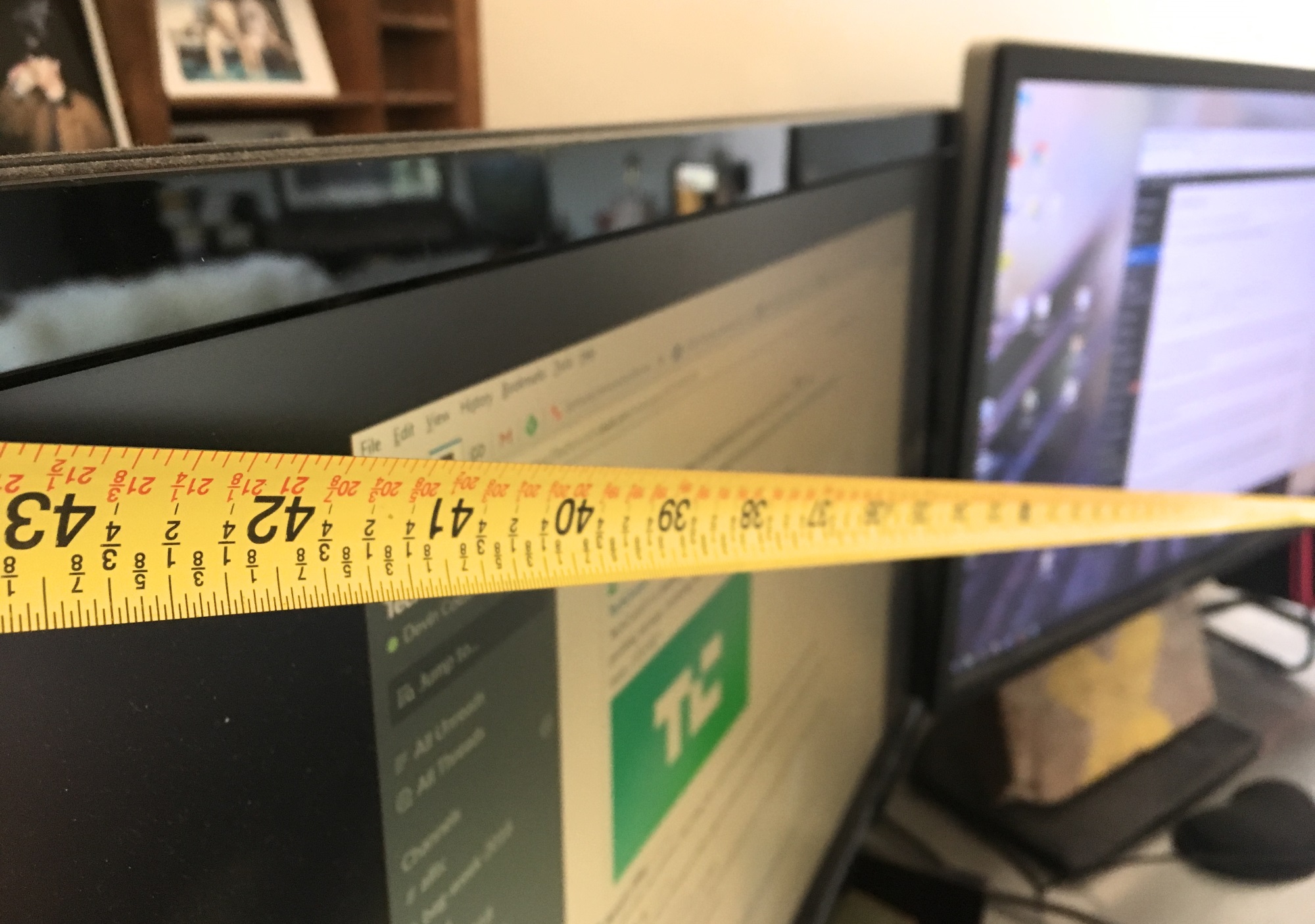 On the other hand, this new one not only adds an extra 120 pixels, bringing it to the far superior 1200 vertical (for a total of 3840×1200), but it is 43 inches corner to corner. Forty-three inches… would that be too big, too small, or would it be…