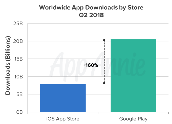 On its app marketplace alone, global downloads topped 20 billion, up 20 percent year-over-year and widening the gap between itself and iOS by 25 percent points to 160 percent. (See below).