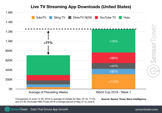 Single network apps grew, too, this earlier report said. FOX Sports downloads increased by 95x for the same period, while Telemundo Deportes En Vivo grew 444x, for example.