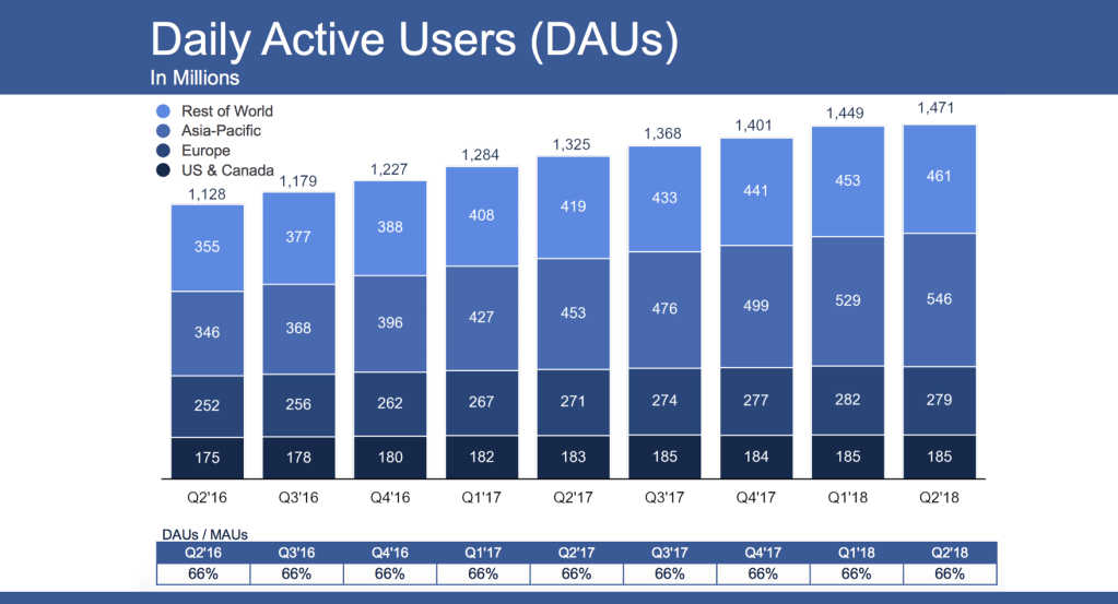 One tough spot for Facebook was that it got stuck at 241 million monthly U.S. and Canada users, the same count as last quarter. After failing to grow in that core market in Q4 2017, it appears that Facebook finally has hit saturation at home after 14 years. And in Europe, Facebook lost 1 million users, sinking to 376 million monthlies. That could be a sign that GDPR requirements and the annoying terms of service changes it had to get users to agree to deterred some from browsing. In fact, CFO David Wehner said the failure to grow in Europe was “due to the GDPR.”