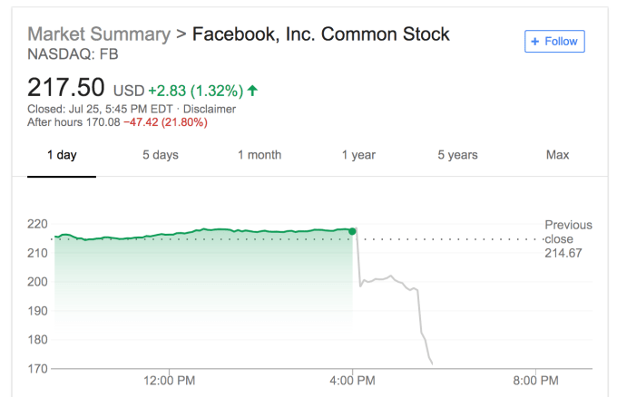 The stock market frowned on the slow growth rates, pushing Facebook’s share price down more than 21 percent in after-hours trading to around $170 per share. That’s down from $217.50 when the markets closed. Initially the share price dropped 7 percent on news of slow user growth, but then fell much further when Facebook announced revenue growth would slow significantly in upcoming quarters.
